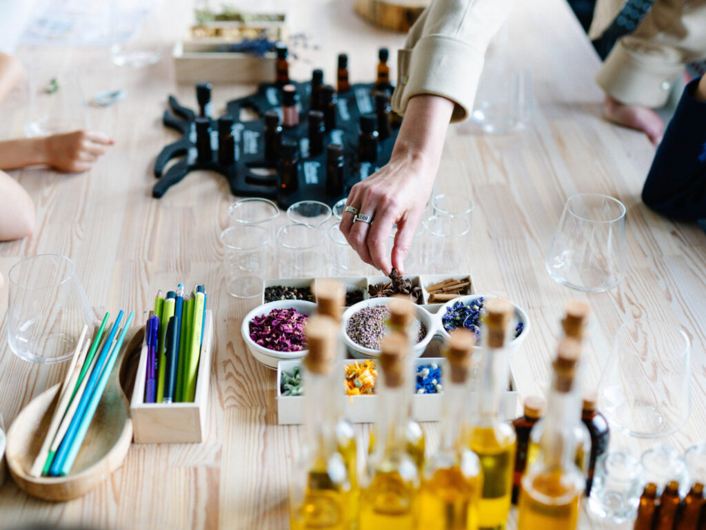 A table full of herbs, spices, flowers, essential oils, vials, bottles, and measuring cups, all ready for you to explore. Tease your senses and imagination, and enjoy a truly sensory experience.