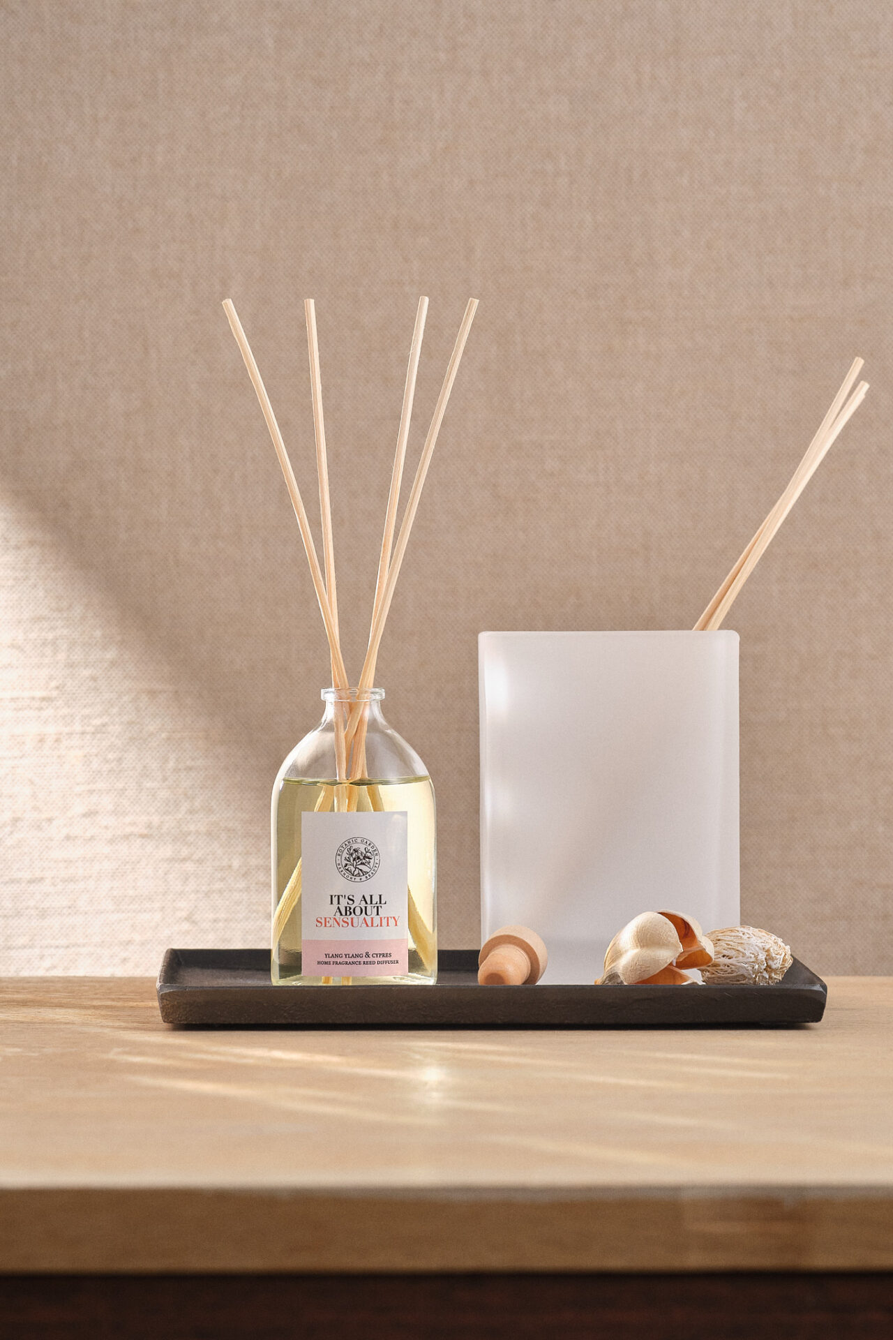 Ingredients: Yang Ylang Essential oil, Cypress Essential oil, Ethyl Alcohol, Rattan Reeds.